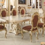 This furniture set collection includes the dining table characterized by precious inlays and an original structure. Highlight the magnitude of the important carved glass showcases with finishing in gold leaf and frames top. Wide and comfortable armchairs with finishing in velvet and in gold leaf define with style space. It is finished in antique brown Color for a dazzling appeal. The traditional and elegant carving design belonging to the classic category reflects the vintage philosophy perfectly well. Throughout this beautiful Dining piece, you will find gorgeous and breathtaking carvings that lend an old-world charm and elegance. Wooden dining is crafted out of solid hardwoods with premium quality Teak wood. This wood has a remarkable grain and is extremely durable. The Table design makes it traditional and classically appealing.
