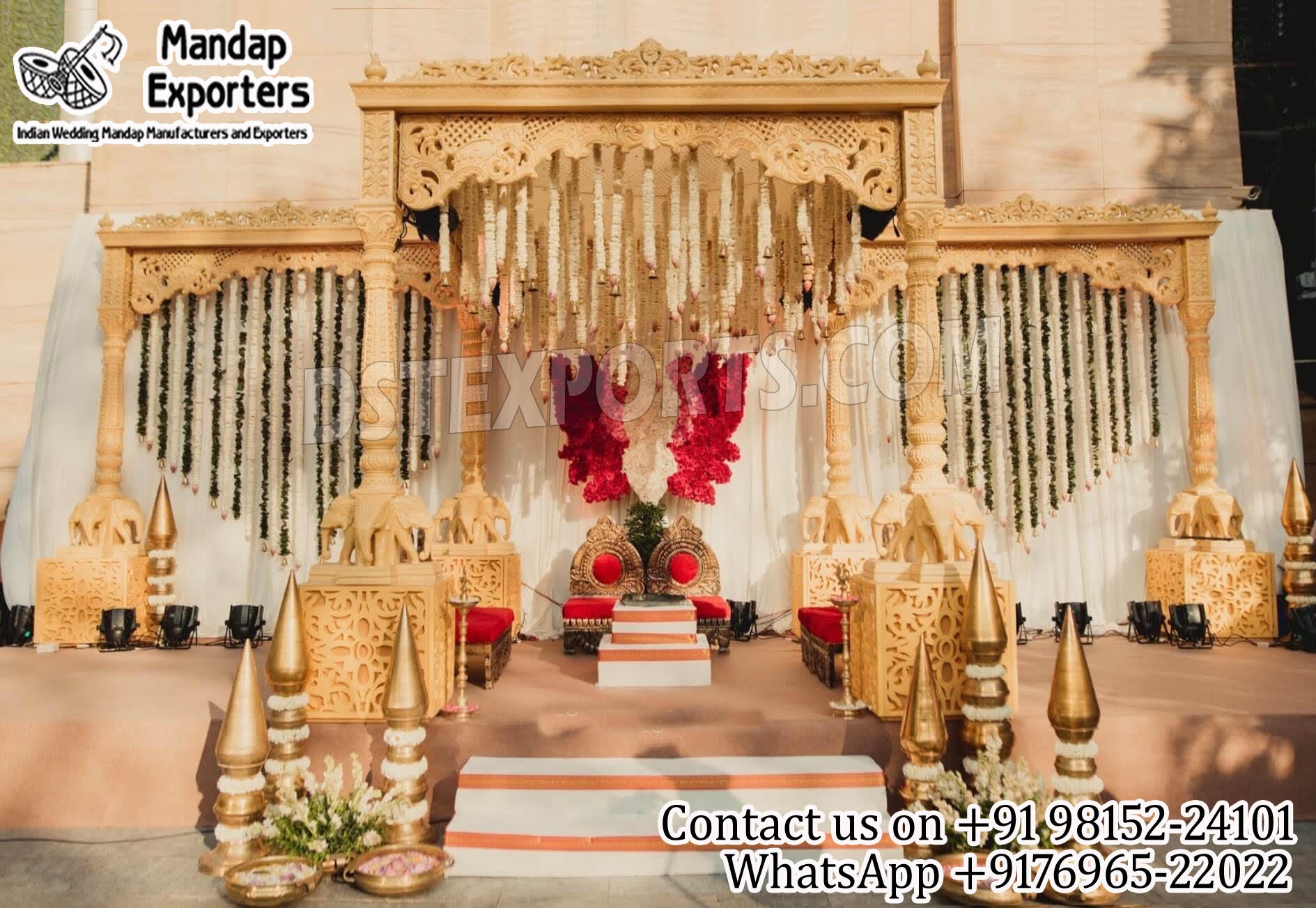 Therefore, we are here to offer you the most fascinating instructions from DST EXPORTS to ensure you own the Pheras of your dreams! We have named this beautiful Trivedi mandapam “Exclusive Elephant Base Wooden Pillar Wedding Mandap “.