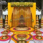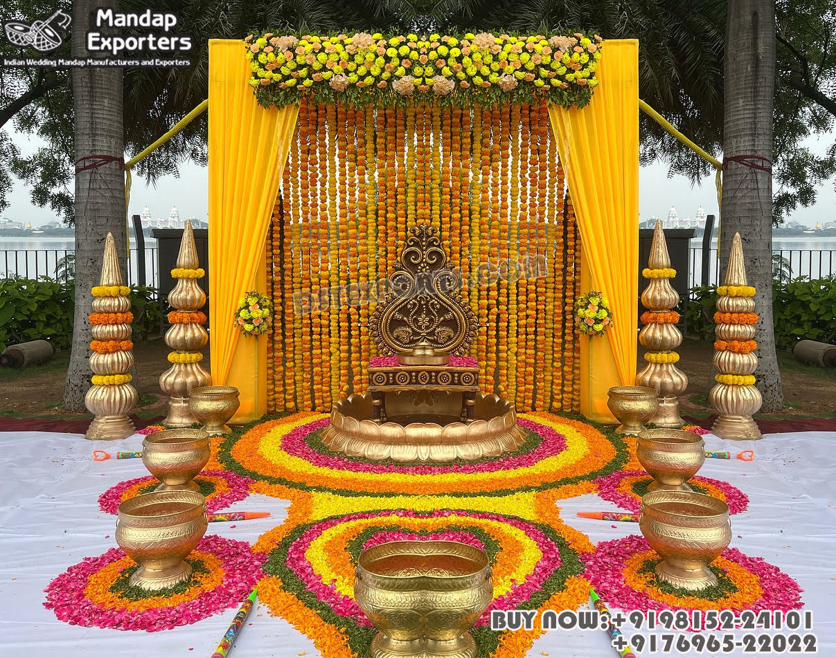 Mandap Exporters ( A Unit of DST Exports) specializes in manufacturing Fiber Props for Weddings so now we are presenting our “Garden Theme Haldi Event Function Stage Decor”  which is originally MADE-IN-INDIA by DST Exports. There is Life-size Lotus design big urli of 5 diameter, Leaf Design wedding chair, Set of four gumbad pillars, Manglam Sananam Pots, Artificial Marigold flower chains & it can also be made in any size according to customers’ requirements. It is especially made for the bride to sit at the time of haldi ceremony and use it as a bathtub.