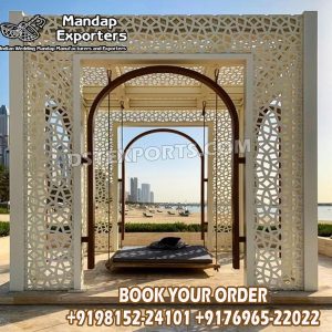 Paired with elegant white seating and minimal décor elements, this mandap offers a clean and luxurious aesthetic suitable for weddings, engagements, and cultural ceremonies. Ideal for banquet halls and destination events, it creates a serene and picture-perfect ambiance.