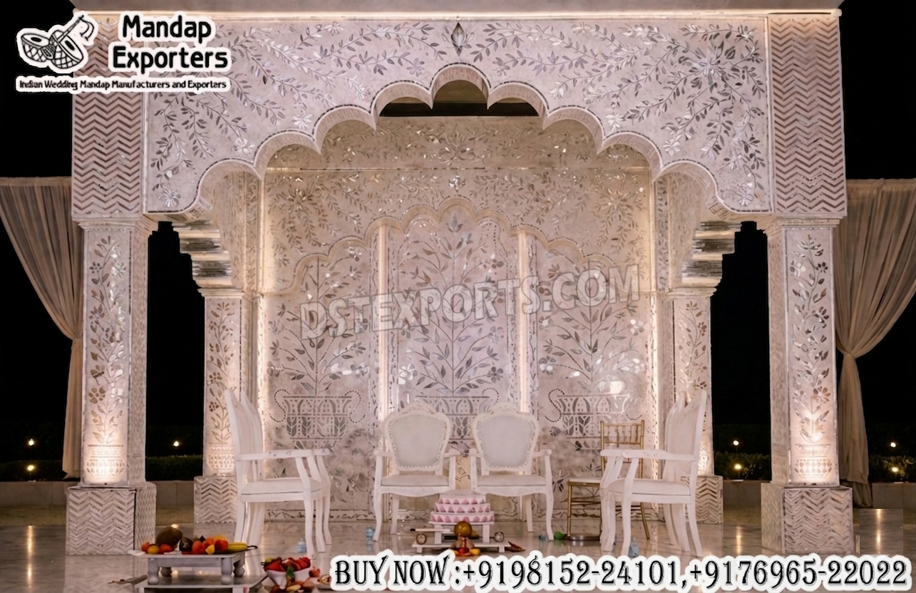 Present a refined and contemporary wedding setting with this Graceful Indo Canadian Wedding Mirror Mandap, designed to blend modern elegance with traditional craftsmanship. This stunning mandap features intricately detailed panels with delicate floral patterns, enhanced by a soft mirror finish that reflects light beautifully and adds depth to the décor.