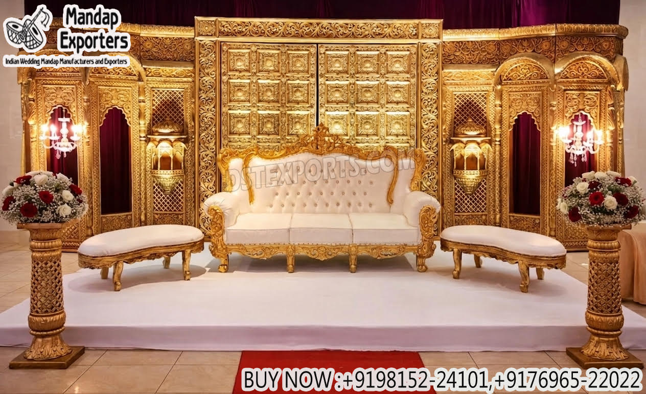Bring regal grandeur to your celebration with this Maharaja Style White-Gold Furniture For Hindu Weddings, designed to create a majestic and luxurious ambiance. The backdrop features intricately detailed panels in a rich antique gold finish, inspired by palace architecture and traditional craftsmanship.