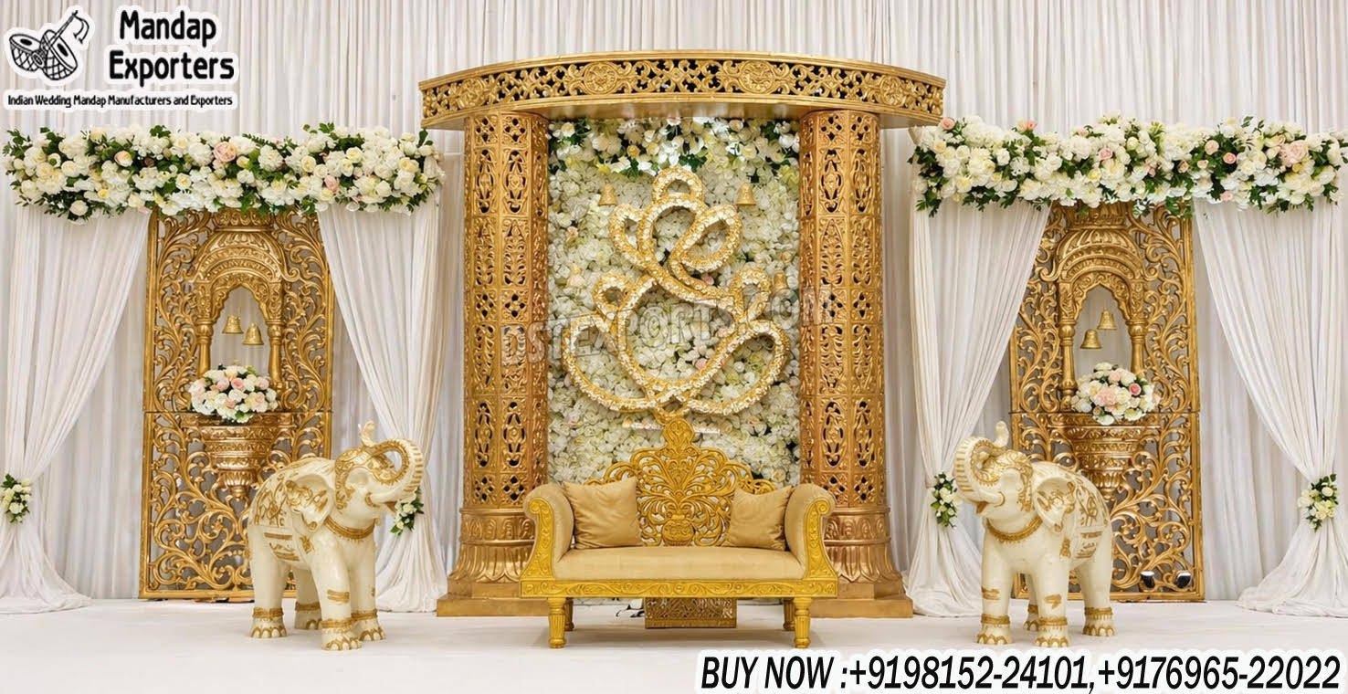 The centerpiece showcases a beautifully crafted gold sofa, perfectly placed against a rich floral wall adorned with an artistic Ganesh-inspired design, symbolizing prosperity and शुभता. Flanked by decorative elephant statues, the stage reflects royal heritage and cultural richness. The side arches with detailed carvings and floral accents enhance the overall symmetry and visual appeal.