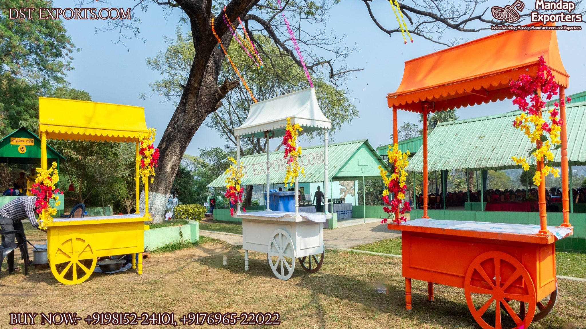 This food cart is provided in any color, in any size and in any shape as per customer’s requirement. This food cart is readily available in our stock. We have many other designs of food carts. You can check out more products from our website www.dst exports.com. DST EXPORTS are the best manufacturers and exporters of wedding mandap, stage, backdrop panels, and all other wedding decoration items. You can freely chat or call us about the product on our WhatsApp +9198/158224101, +918675333339