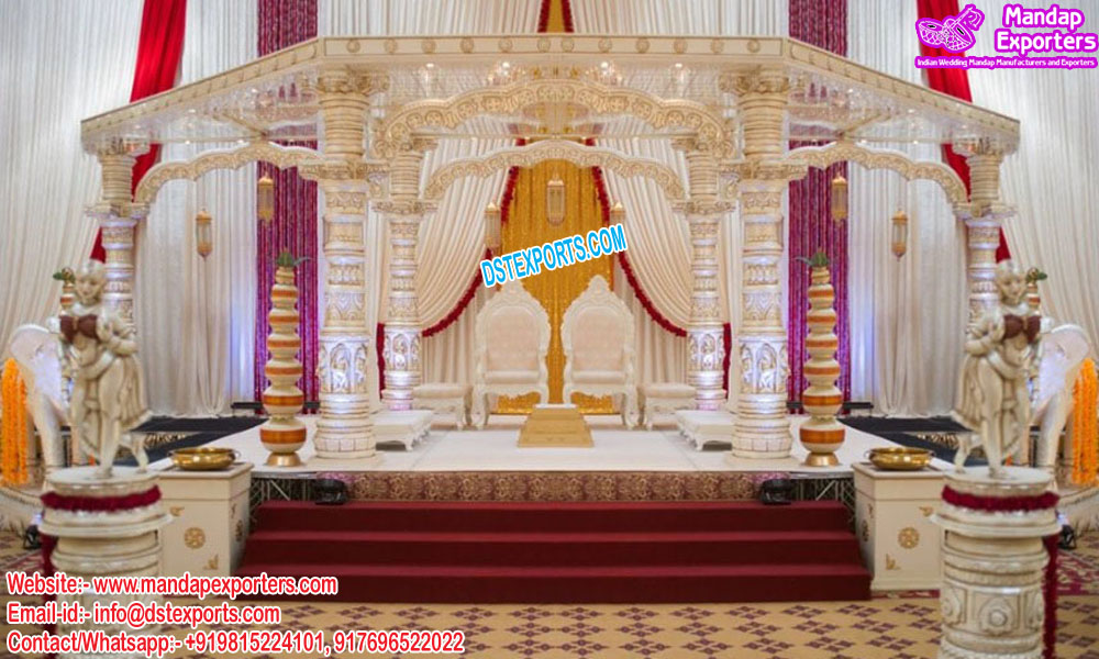 South Indian Devdas Pillars Wedding Mandap Ontario:- This is a Grand fiber Dev Pillar Mandap. This South Indian Devdas Pillars Wedding Mandap Ontario is Designed and Manufactured by DST EXPORTS. This Stage set has its own unique beauty. This Wedding Stage setup is too popular in America country and as well as Ontario, California, Canada, Europe, Texas, Boston, etc. This wedding mandap will give a traditional appearance at the wedding event.