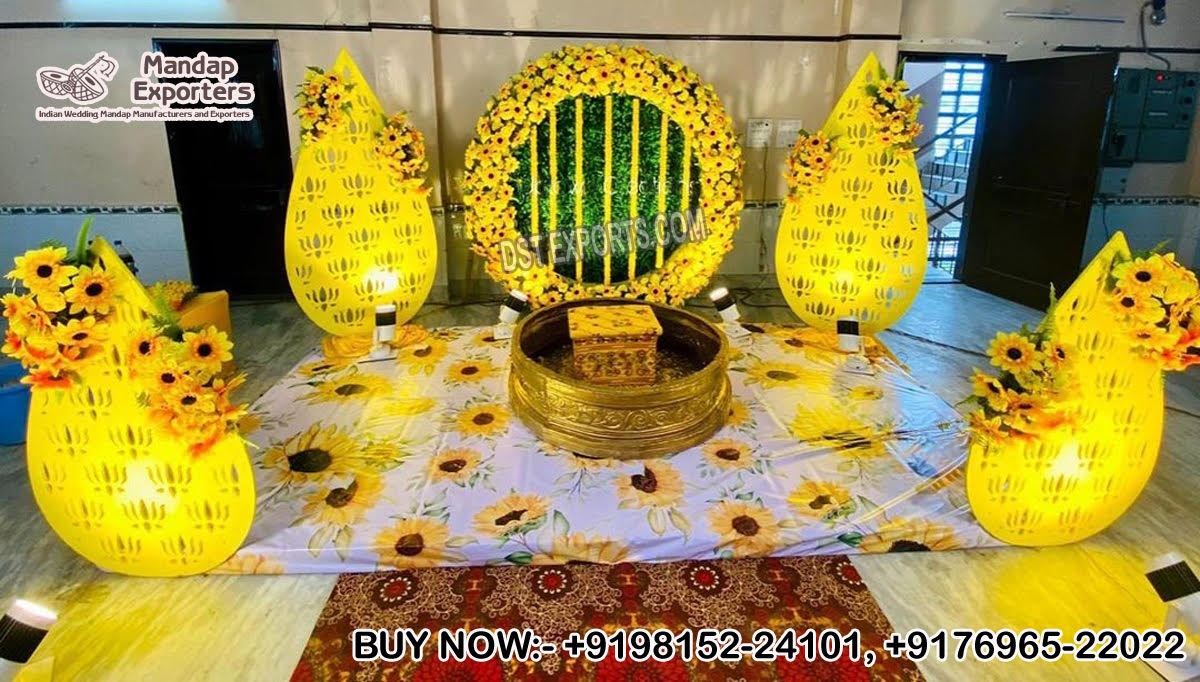Mandap Exporters ( A Unit of DST Exports) specializes in manufacturing Fiber Props for Weddings so now we are presenting our Special Hindu Wedding Haldi Ceremony Decoration which is originally MADE-IN-INDIA by DST Exports. Set Include – One metal Round Panel + Four leaf style Metal Backdrop + One Fiber Urli . These metal leaf style metal panels are made of metal with premium-quality deco-painted, and self-standing. It is a Life-size Lotus design big urli of 5 diameter, Decorative triangle Frame with flower chains  & it can also be made in any size according to customers’ requirements. It is especially made for the bride to sit at the time of haldi ceremony and use it as a bathtub.
