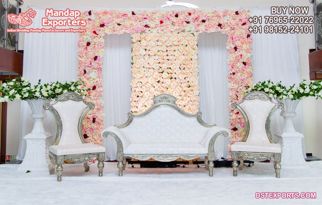 Splendid Wedding Decor Silver Carved Sofa Set::- Wedding Furniture is the Center of attraction of marriage stage so now we’re presenting King Queen Throne Sofa Set with gold finishing. This is marriage event Stage lounge Set designed and manufactured by DST EXPORTS. This Furniture is well known as “ Splendid Wedding Decor Silver Carved Sofa Set”. This Type of Wedding Furniture Always gives a classic look at any event. This is the Brand New Sofa Set for all types of Western as well as Indian Traditional marriages.