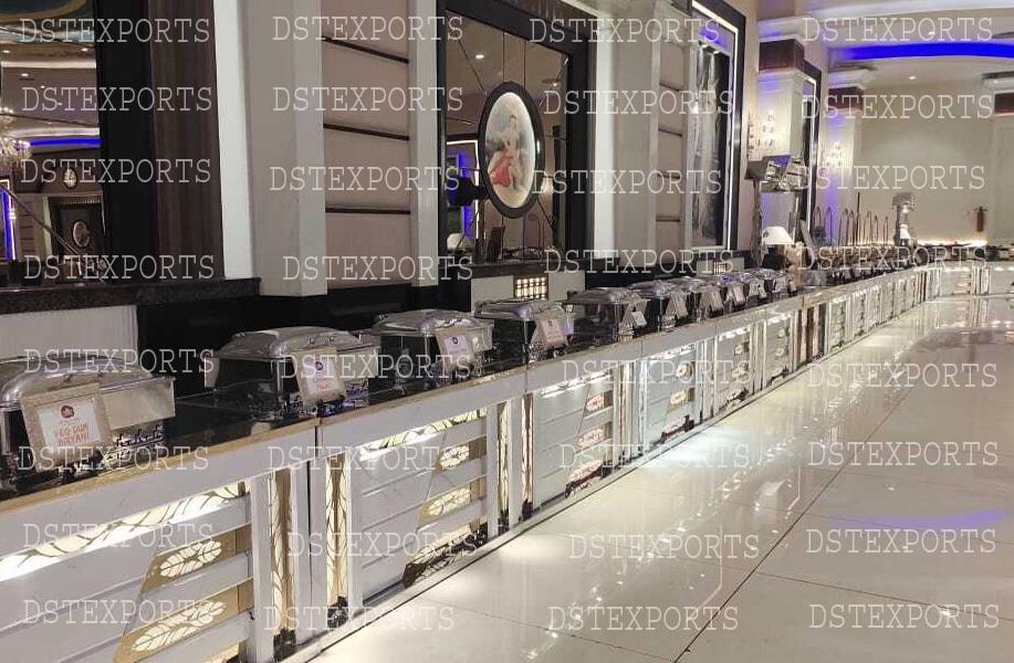 Stainless Steel Silver Buffet Table For Wedding:- Mandap Exporter is the original manufacturer and exporter of wedding decoration items, One of them is the Wedding Food Stall Buffer. We are the original makers of such type of food stalls and candy carts. DST Exports presents a newly designed “Stainless Steel Silver Buffet Table For Wedding”.
