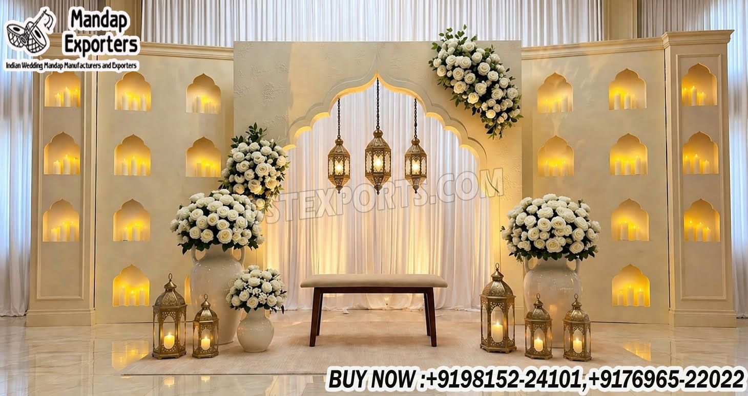 Create a warm and enchanting ambiance with this Unique Arabian Night Theme Stage Backdrop Frames, designed to bring sophistication and charm to your special occasion. This backdrop features beautifully crafted panels with arched cutouts, softly illuminated with candle-style lighting that creates a serene and romantic glow.