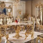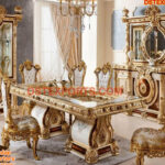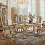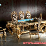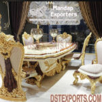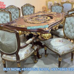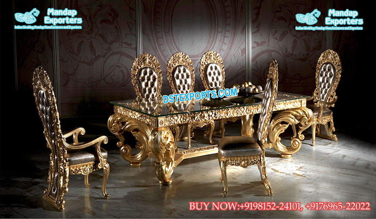Victorian Gold Finish Dining Furniture Set :-DST EXPORTS presents to you a handcrafted Wooden Dining Set made from premium quality Teak wood by us. A Victorian style dining set that features a dining table, two master chairs with arms and six side chairs without arms with Beautiful leather seats. The traditional and elegant carving design belonging to the classic category reflects the vintage philosophy perfectly well. Throughout this beautiful Dining piece, you will find gorgeous and breathtaking carvings that lend an old-world charm and elegance. Wooden dining is crafted out of solid hardwoods with premium quality Teak wood. This wood has a remarkable grain and is extremely durable. The Table design makes it traditional and classically appealing.